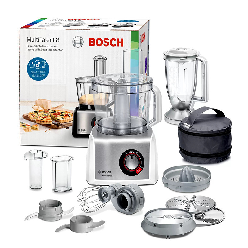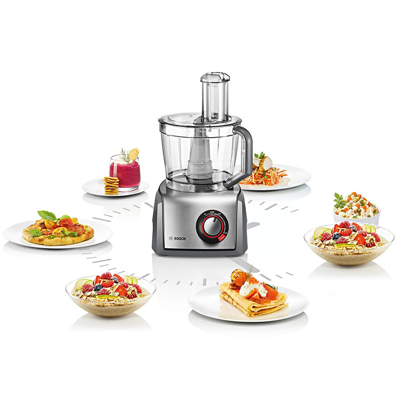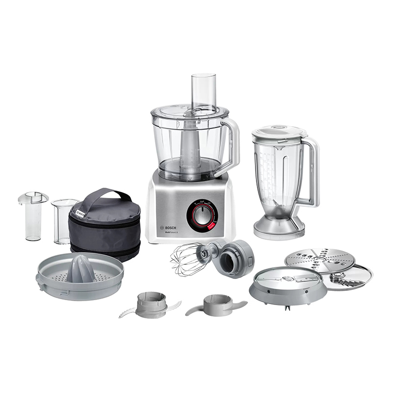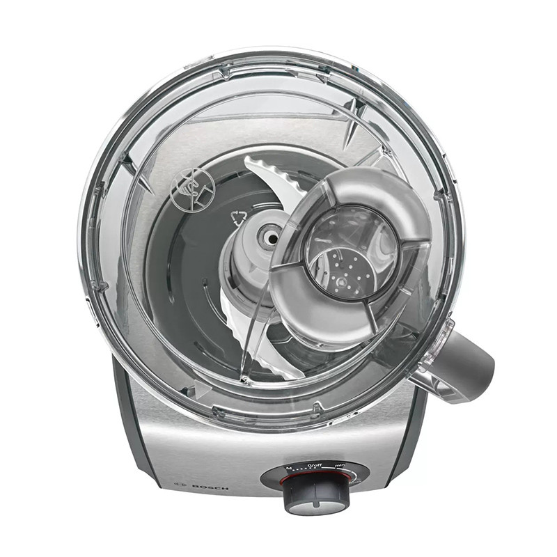 غذاساز بوش MC812S734G یکی از پرکاربردترین محصولات بوش است. این غذاساز که بیش از ۵۰ کارکرد مختلف دارد از سری Multi Talent 8 (بالاترین سری غذاسازهای بوش) می باشد و می توانید با آن انواع غذا، آب میوه و اسموتی های خوشمزه تهیه کنید. از قابلیت های این دستگاه می توان به قابلیت ورز دادن، مخلوط کردن، خرد کردن، عصاره گیری آب مرکبات، هم زدن، رنده کردن در سایزهای کوچک و بزرگ و برش یا برش دادن به کمک دیسک های استیل اشاره کرد. . قدرت موتور این غذاساز ۱۲۰۰ وات می باشد. پنل این غذاساز مجهز به ولوم چرخشی است که با استفاده از آن می توان سرعت را تنظیم کرد. همچنین دارای عملکرد لحظه ای (پالس) است که باعث می شود دستگاه با حداکثر توان کار کند. ابعاد این غذاساز 430x250x300 میلی متر و وزن آن ۵ کیلوگرم است.با دیسک رنده دو طرفه Bosch MC812S734G می توانید غذا را هم به صورت ریز و هم درشت رنده کنید. یک تیغه برای برش دادن غذا طراحی شده است. از دستگاه برش برای برش سیب زمینی استفاده می شود. همچنین می توانید آب پرتقال و لیموی تازه را با آب میوه گیری مرکبات درست کنید. همچنین انواع خمیر توسط خمیر پلاستیکی دستگاه قابل ورز دادن است. و از سری همزن می توان برای تهیه کیک، خامه و تخم مرغ استفاده کرد. تیغه های این غذاساز از فولاد ضد زنگ با تکنولوژی Supercut ساخته شده است.حجم ظرف مخصوص غذاساز که از پلاستیک مقاوم ساخته شده و قابلیت خرد شدن و پوره شدن حجم زیادی غذا را در هر بار استفاده دارد ۳.۹ لیتر می باشد. میکسر این غذاساز نیز از پلاستیک تریتان ساخته شده و حجمی معادل ۱.۵ لیتر دارد.بدنه این دستگاه دارای پایه های ضد لغزش بوده و در حین کار حرکت نمی کند. بنابراین می توان آن را به راحتی روی هر سطحی قرار داد.