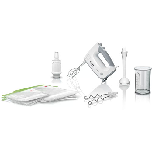 همزن دستی بوش مدل MFQ364V0 با توان ۴۵۰ وات، موتور پرقدرت و در عین حال کم صدا قادر است مایه ی انواع کیک، شیرینی و کوکوها را به خوبی مخلوط کند، خمیر نان را ورز داده و آماده کند، تخم مرغ هم بزند و آرد و کره و خامه را نیز به هر شکلی که می خواهید مهیا سازد.
